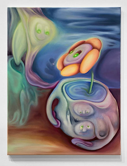 Xiuching Tsay’s work is essentially to illuminate the objects of memories and to resurrect their essences and rediscover their hidden characters through an ecstatic quality of vision. She adopts the concept of hallucination in order to recondition her perceptions towards the intimated objects. This hallucinatory practice is experimented with the concept of water because water has both metaphoric and substantial qualities that unfold infinite visions as water melts all the possible subject matters into the most ambiguous forms. Tumultuous movement of waves introduces her to the fantastical world of other spiritual selves. These unknown beings that are roaming in the sea encourage the artist to seek their true existences, with the unknown self residing at the bottom of an abyss. Xiuching Tsay’s paintings of grimacing figures and cascading, steaming, neon liquids, all rendered in a vaguely radioactive palette, are examples of alluring excess. She takes paintings as a journey narrative, set in a surreal seascape. With uses of relentless and unpredictable movement, her paintings give an open-ended story and there are different possibilities to interpret these dreamlike characters.