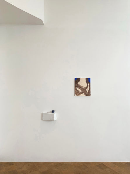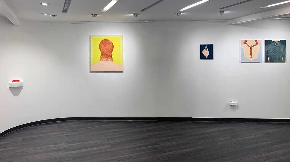Each painting acts as a frame for this self-conscious body, or for the spaces that it might inhabit; forms are flattened, bodies are stretched out and illusion is mocked. Beside them, ceramic sculptures pretend to be used tools – clogged up and haggard, like those found in the back of a bathroom cupboard, usually hidden from the eyes of others: objects which are not so commonly shared. Pushed and moulded in their soft state, they are paused at a particular moment in time when hardened in the kiln. There is a sense that these objects and bodies are not yet ready to receive guests, that they urgently utter, “wait a minute, I’m not decent” through a closed bedroom door.